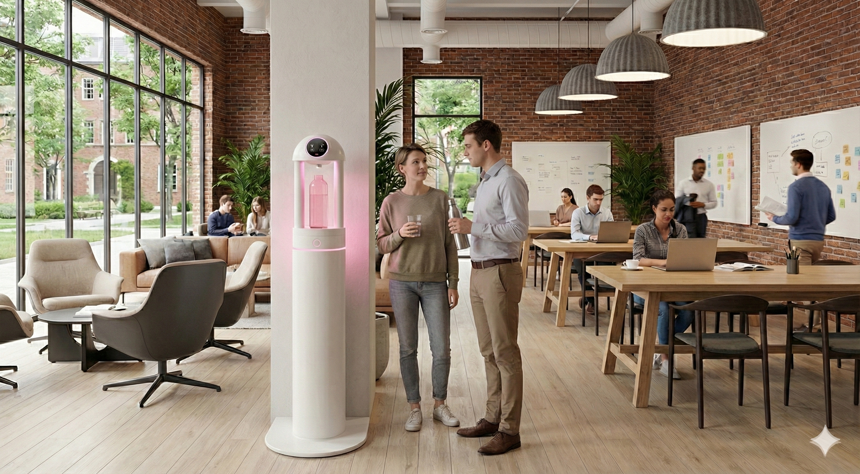 Améliorez le bien-être de vos collaborateurs en leur offrant une solution d’hydratation saine. Fini les PFAS dans l’eau des fontaines classiques, les micro-plastiques des bouteilles et le sucre des sodas consommés au bureau.